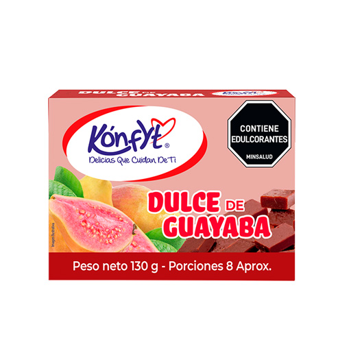 Pulpa de guayaba, humectante (sorbitol) gelificante (pectina) acidulante ácido cítrico, color (caramelo) conservante (benzoato de sodio) y edulcorantes artificiales.
